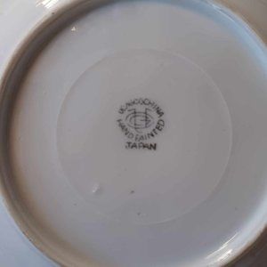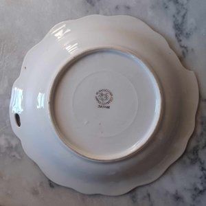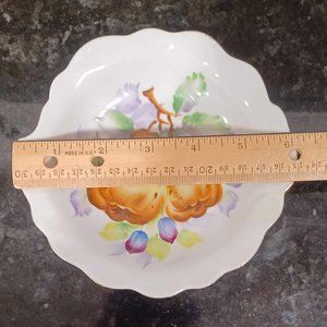 Rare scalloped edge, leaf shape with slight embossed leaf veins. Good condition. Thin gold detailing on rim, slightly faded in one spot. Hand painted with two pears and floral/leaf detail. Maker's mark is on back. UCAGCO Japan.