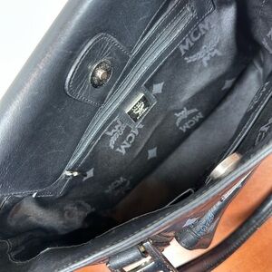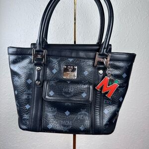 MCM Visetos Tote Bag Black Front Pocket Charm Logo