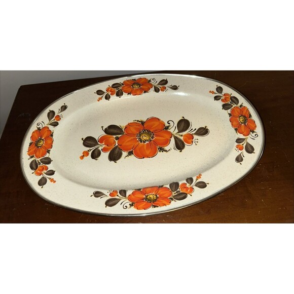 MCM Vintage 1970s Sanko-Ware Show Pans Metal Enamel Orange Poppies Large Platter