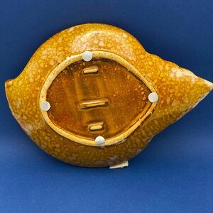 Beautiful shell-shaped multi colored plate in cream, orange and blue. Dish is suitable to serve small snacks or as a decorative piece. Add a touch of mid-century charm to your home. Hand wash only with mild soap, rinse and pat dry. No chips or cracks. There is some small scratches on bottom of plate as pictured. Small rubber pieces placed on bottom to prevent further damage.