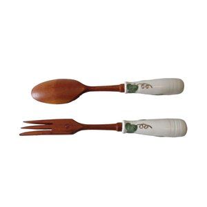 Vintage MCM decorative serving spoon and fork with a unique grape vine relief design on ceramic, exquisitely crafted from wood. Perfect for adding a rustic charm to your dining table.