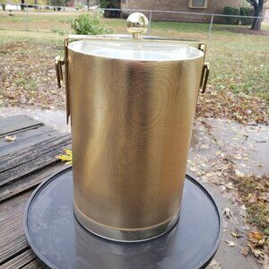 This vintage champagne or ice bucket is about 11 in tall and 8 in wide, it has a gold foil exterior, plastic bucket (non-removable), the lid tilts off. Minor scratches on the bucket.