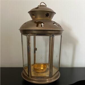 The top has holes in the shape of stars, starbursts, and camels. Stars are also etched on the glass. Opens for a tealight. No flaws or defects. Some wear on the bottom. The brass has some changing-colors due to its natural age.