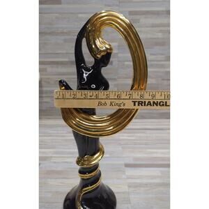 Add a touch of Hollywood Regency glamour to your home decor with this stunning vintage ceramic statue from Vanguard Studios. The black and gold color combination creates a high gloss finish that is sure to catch the eye of any collector. Measuring 22 inches in height and 8 inches in length, this rare statue features a beautiful fashion model in a mid-century modern Hollywood Regency style.