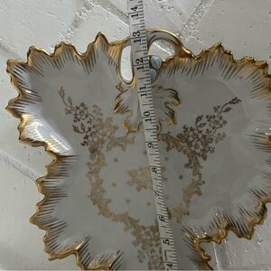 MCM Vintage White RPM Gold Glit Scroll Trimmed Leaf Dish Painted Blue Victorian