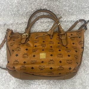 MCM Visetos Drawstring Leather Trimmed Tote. Pre-owned. Minor signs of wear, scuffs. See pictures