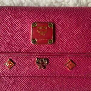 MCM Visetos Leather Studded Logo Motifs Medium Trifold Wallet Fuchsia Magenta