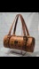MCM Visetos monogram barrel shoulder bag in cognac brown leather and gold-tone hardware. Features dual handles and iconic printed Visetos inside and out.