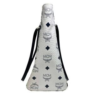 The MCM Visetos all-over print tote bag/shoulder bag in white and blue features a square shape, zip closure, and silver hardware accents with a gold plated MCM plaque. This large, lightweight bag is perfect for travel and casual occasions, with inner pockets and a water-resistant finish. Made of leather with a coated canvas lining, this tote from MCM is both stylish and practical, offering a folding design for easy storage when not in use. The bag also includes a pouch and luggage tag accessories, making it a versatile addition to any woman's wardrobe.
