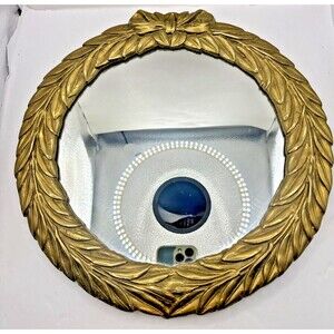 MCM Vtg Round Laurel Leaf Framed Accent Mirror With Bow Detail Hanging Gold 13”
