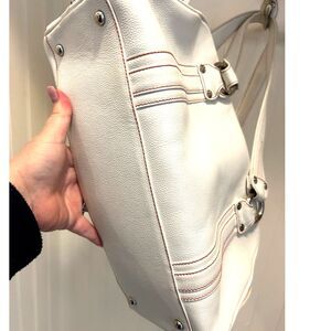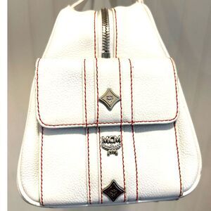 MCM RARE large pure white leather satchel with amazing silver hardware and RED stitching. The corners, hardware, handles, leather and interior all look amazing! This one is very rare and a stunner! It measures 13" x 8" x4"