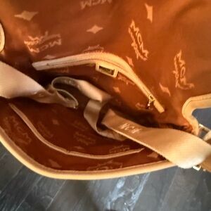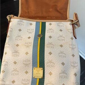 Stylish MCM crossbody bag. Features white leather with gold accents. Iconic logo pattern. Perfect for everyday use.