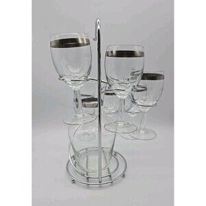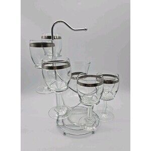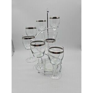 This MCM Wine Decanter Set with 6 Wine Glasses is a stylish addition to any barware collection. Made in France, the set features a silver banded design that adds a touch of elegance to any dining or entertaining occasion. The decanter and glasses are crafted from high-quality glass, making them both practical and visually appealing.