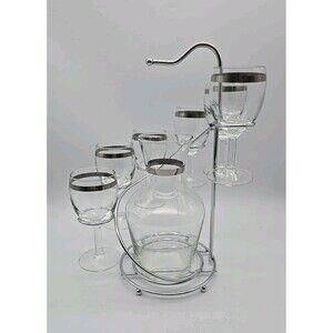 MCM Wine Decanter Set with 6 Wine Glasses Silver Banded Made In France NICE