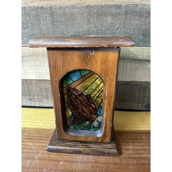 Wood And Stained Glass Praying Hands Candle Box - Wear 9” tall and 6x5 wide. Has wear on wood from age. Please ask any questions and check out my other items. Have a joyful day -TMV