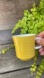 Bright yellow mugs with white handles. Perfect for modern dining.