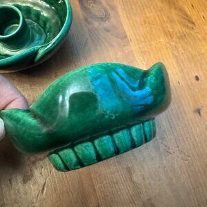 Enhance your holiday table setting with this vintage Mid-Century Modern green candlestick. Perfect for Christmas decor, it adds a touch of elegance and charm to any festive occasion.