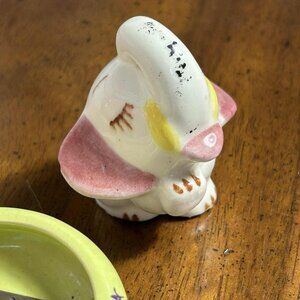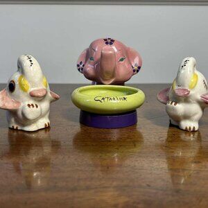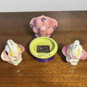 A pair of vintage elephant salt & pepper shakers with a barely legible Michigan on the trunks. Lots of crazing but no chips. Cute.