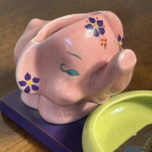 A Catalina Island souvenir with a pink elephant porcelain succulent planter and a small round green porcelain tray with Catalina hand written on the front, both mounted to a 5” x 2” purple painted wooden base. Some crazing on the tray, no chips on either. Excellent.