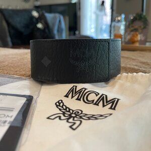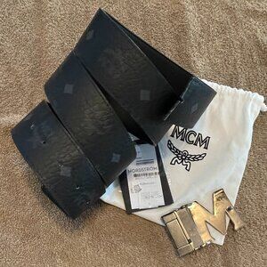 Nordstrom MCM black leather belt with silver buckle, it is 49" long, reversible, the M buckle looks tarnished but the belt is in great condition