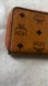 Limited edition, MCM zip wallet has corner rubs, rubs along the leather possible scratches on the leather possible dirt inside there's rubs on the card slots. It looks white and a couple white spots possible coin, residue, and dirt. And lint.