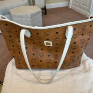 MCM medium size shopper tote in Visetos. White leather trim and handles. Gently used. Matching Visetos trifold wallet.