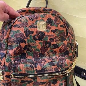 Very cool MCM x BAPE STARK large leather backpack in camo visetos. Bathed in BAPE’s iconic camo color. It’s crafted for the street wear disciple. This limited edition piece features adjustable straps, multiple pockets and padded compartment for safety storing a laptop or tablet. Zip closure. Leather top handle. Adjustable shoulder straps. Front zip pocket. Interior sleeves for 13” laptop storage. Excellent used condition.