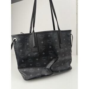 Elevate your style with this stunning MCM Visetos tote bag. Designed with a beautiful canvas exterior and a reversible feature, this bag is perfect for any casual occasion. The gold hardware and black leather handles add a touch of elegance to this medium-sized tote, making it a must-have for any fashion-forward woman.