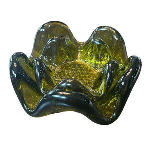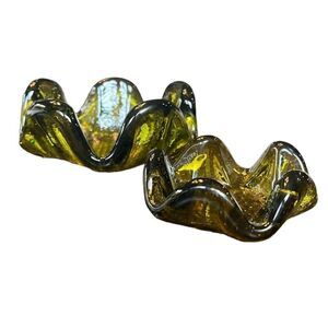 This set of two nesting ashtrays/candle holders features a beautiful floral and garden motif in a vibrant green color. The hand-blown art glass production technique gives each piece a unique and special touch. The finger design adds a modern twist to this mid-century modern set. Perfect for any collector or lover of decorative pottery and glassware. Made of high-quality glass material, this set is sure to impress any guest.