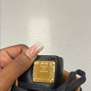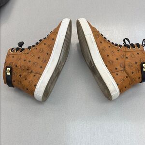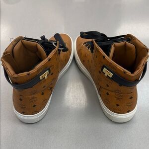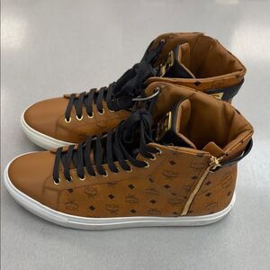 Elegant high-top sneakers with tan leather and black accents. Features signature MCM design and gold detailing.