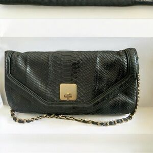 Elegant black snake print clutch bag with a chic chain strap. Perfect for evening outings and special occasions.