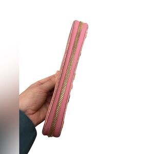 Pink stamped leather zip around closure.