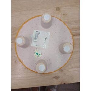 Pre-owned but never used. Multi-colored ceramic plant pot . Hand-painted in MCM type design colors are gray pink and yellow on a cream background with some hand strokes throughout. Four pedestal feet with small foam protecters on bottom