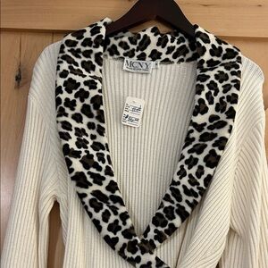 MCNY, Cream Sweater with Faux Fur Leopard Print Collar- NWT