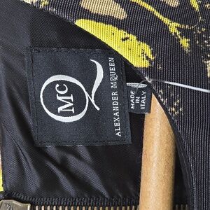 MCQ by ALEXANDER MCQUEEN dress comes in black and lime green butterfly wing print faille with a halter neckline, peplum sides, and AA line skirt. Made in Italy.