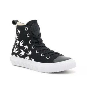 Experience luxury with the MCQ Alexander McQueen Swallow Black High Top Slip-On Sneakers, designed for style and comfort. Made for the modern woman, these sneakers are new in box and ready to elevate any outfit.