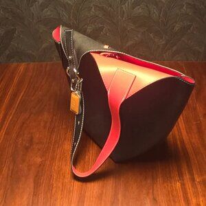 Beautiful black leather with red interior, comes with removable matching fabric organizer. Unique — you won't see anything like it anywhere else. MDBM brand. Like new condition — I loved it, but I just can't make it work with the rest of my closet. Hard to measure, but roughly 6x6x9.
