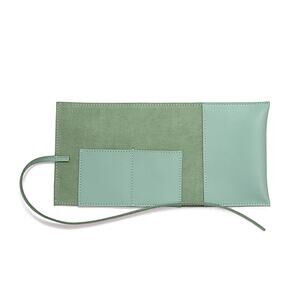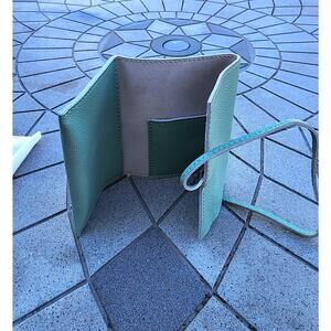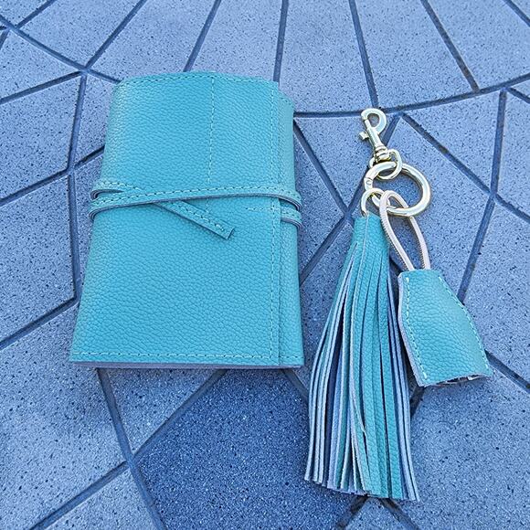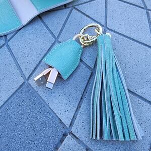 NIP: Stylish, mint green cow leather tech travel roll up organizer & tassel keychain set with a hidden USB charging cable. Add your small tech essentials: charging cords, earphones & other tech accessories to the slip pockets & simply roll it/secure it with the leather single strap.