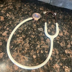 White marble/rose gold stethoscope, in perfect working condition. The name Morgan is engraved on the bell. This was gifted to me when I was a pre-nursing student but I switched majors and have no need for it!