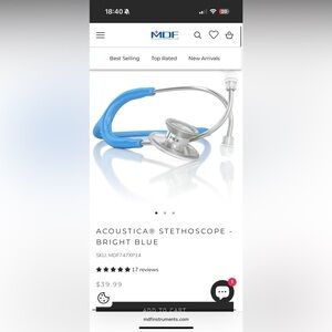 High-quality MDF Instruments stethoscope. Bright blue colored. Extra ear pieces inside. Ideal for medical professionals. NEVER USED