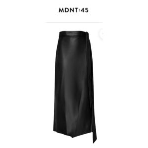Elevate your wardrobe with the MDNT:45 high-waisted wrap skirt, a seamless blend of edgy style and comfortable fit. Crafted from premium faux leather, this midi skirt is a versatile piece that transitions effortlessly from day to night. Its classic black hue ensures it can be paired with virtually any top for a chic, tailored look. The skirt features a flattering high-rise design that complements the silhouette, while the wrap style adds a touch of sophistication. Designed for the fashion-forward woman, this XL size skirt fits true to size and is a must-have for those who appreciate a blend of modern design and timeless elegance.
