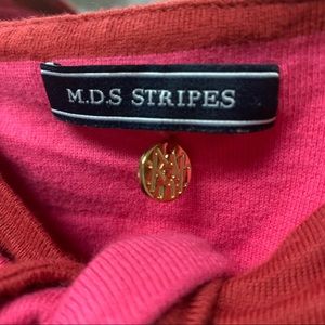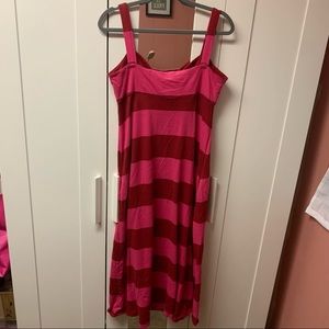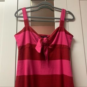 Cotton tie-front midi dress by MDS Stripes in good used condition. Bold red and pink stripes, thick tank straps, tie on front and has pockets. No flaws but worn. Measures approx 19” across bust and 50” long. Label reads “2” but measurements for this dress would likely fit up to a Medium.