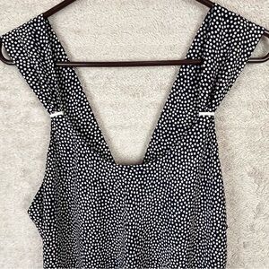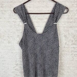 Such a pretty long nightgown by Miss Elaine black base with white polka dots, split open back in like new condition.
