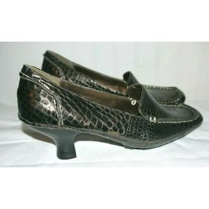 FOR SALE IS A PAIR OF NEW WITHOUT TAGS, ME TOO OR MTNY BROWN LEATHER CROC HEELS IN SIZE 6. NONSLIP BOTTOMS.