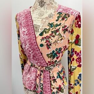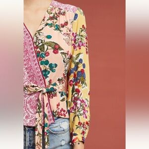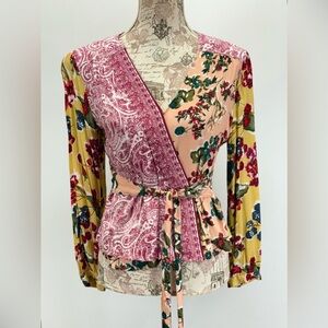 MEADOW RUE for ANTHROPOLOGIE Pink and Gold floral long sleeve wrap top size 6