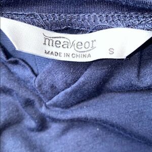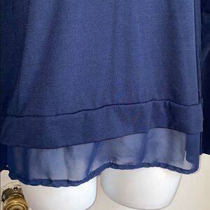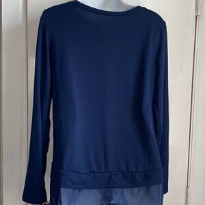 Navy blue washable long sleeve tee with v neck, sheer trim at the hem and collar. Measures 18” from armpit to armpit and 23” from top of shoulder to bottom hem. Great condition.