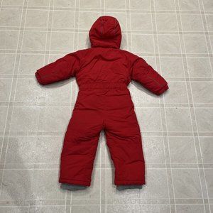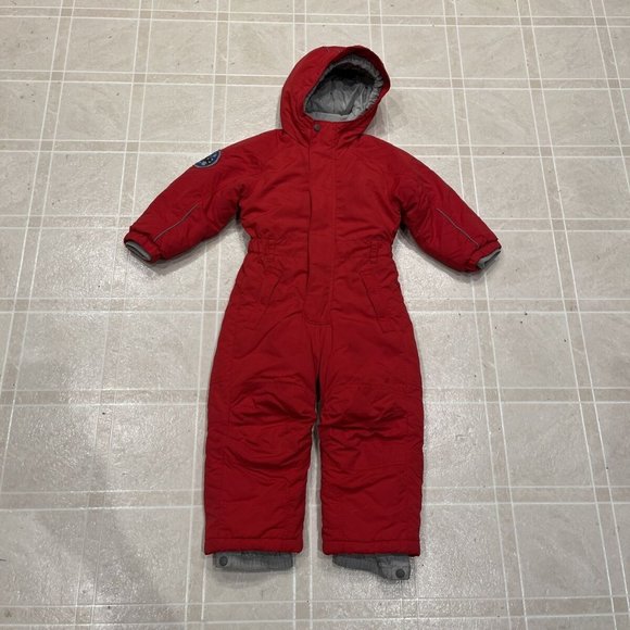 Snowsuit features an attached hood, front zipper with velcro storm cover, elastic ankle gaiters, knit internal wrist cuffs. A nice warm suit for your little person. See the one picture where the suit has marks on it.