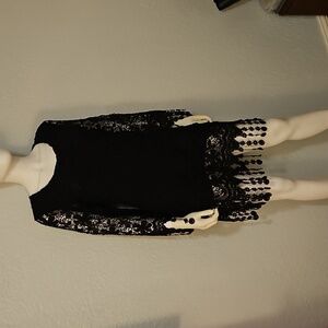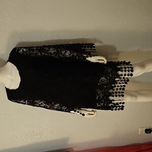 Chic black lace dress featuring intricate fringe details. Perfect for evening wear.