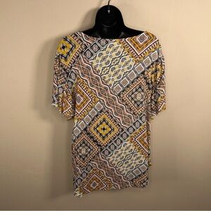 MEDIUM RUBY RD TRIBAL GEOMETRIC TOP SHORT SLEEVE ORANGE GOLDEN YELLOW BOHO
