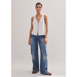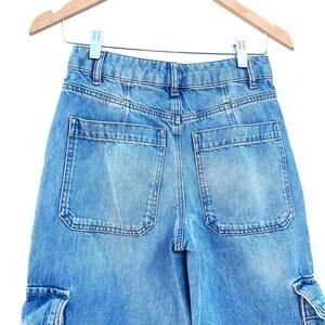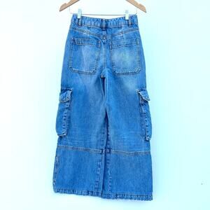 Channel effortless utility style with these ME+EM baggy wide-leg cargo jeans in a perfectly faded vintage wash. Designed with oversized patch and flap pockets, these trousers blend workwear details with laid-back streetwear energy. The roomy silhouette and soft denim create a relaxed fit ideal for everyday wear, festivals, or off-duty styling. Pair with sneakers or sandals for a cool, modern look with a nod to ‘90s fashion.